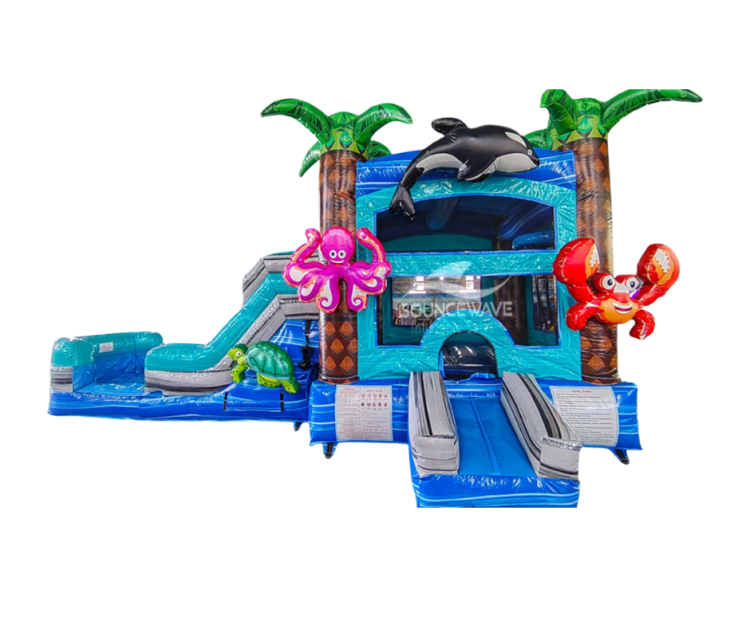 The ISLAND DROP MINI COMBO is a vibrant inflatable bounce slide that transforms playtime into a high-seas adventure with swappable pirate and ocean-themed designs that can take any kids imagination to the next level. It’s the perfect rental for birthday parties, holiday weekend fun, church events and school fun days for the kiddos!!! Can be rented wet or dry.