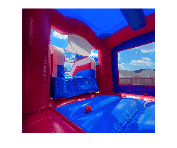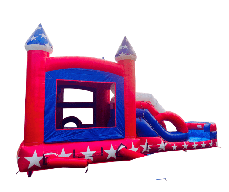 Make a STAR SPANGLED SPLASH at your next 4th of July barbecue. This combo unit features a 9ft slide that can be used wet or dry. The All American also sports a large bounce house with four inflatable basketball hoops. Foam basketballs included with each rental. Show your American pride with this one of a kind slide. Can be rented Wet or Dry.