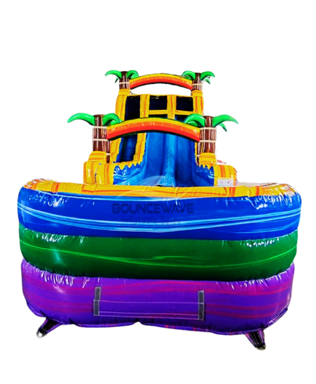 Goombay Splash is a tropical-themed hybrid waterslide that combines bouncing fun, smooth sliding and splash-down excitement! Bold, colorful, and packed with island vibes, this dual lane water slide is perfect for racing into the deep landing pool. This crowd favorite is the perfect way to beat the heat and bring your beach party to life!